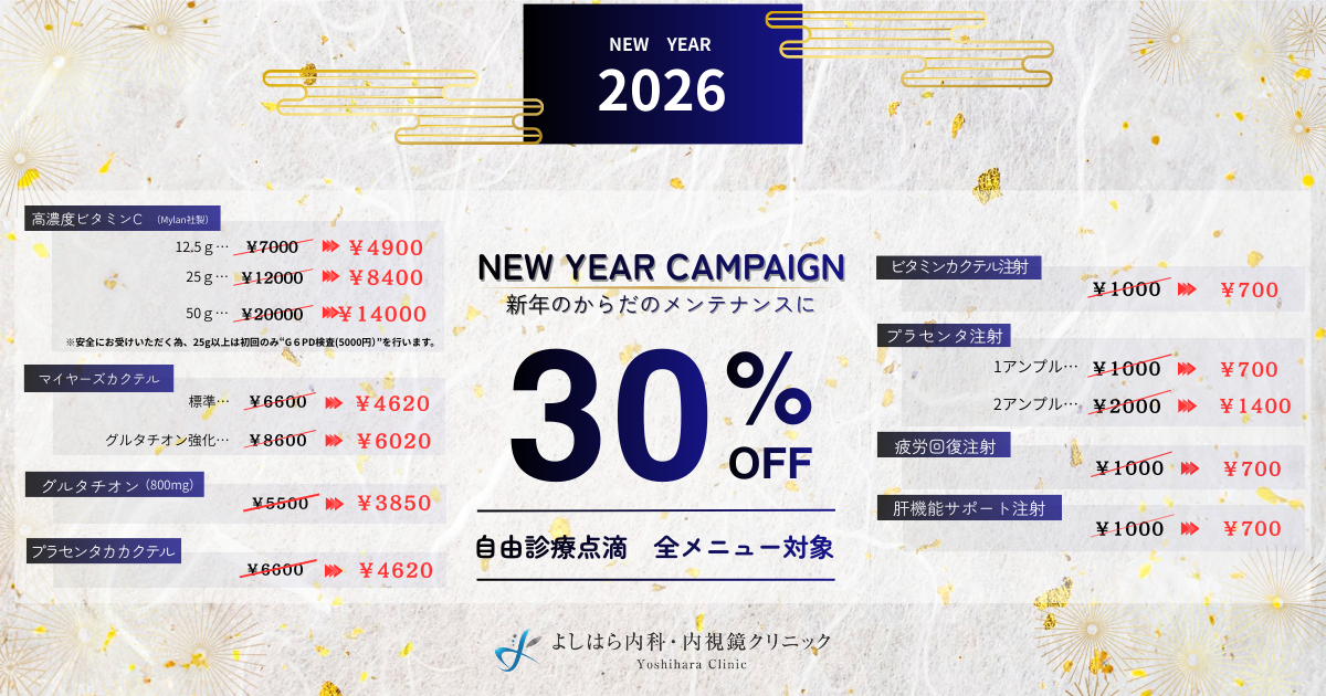新年の体調管理・コンディション調整を目的に、自由診療の点滴・注射メニューを全メニュー30%OFFでご利用いただけるキャンペーンを実施いたします。